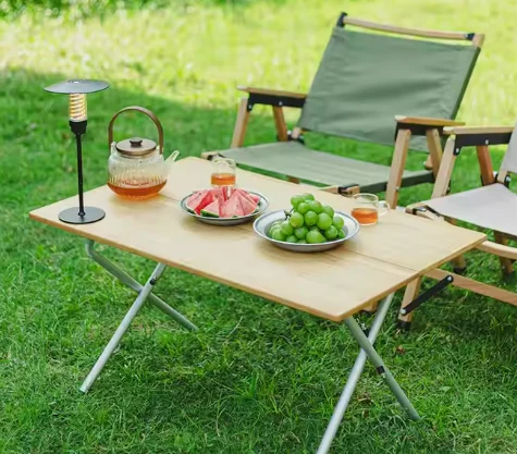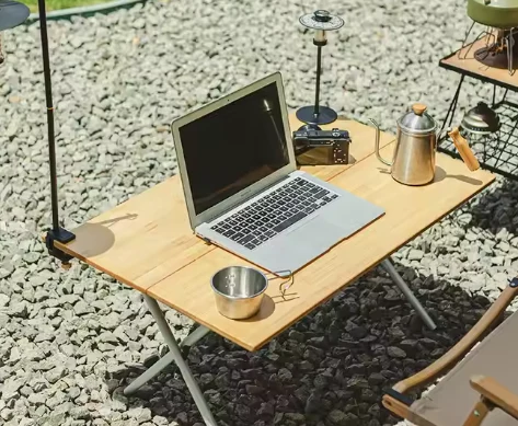 Бүктөлүүчү бамбук жана алюминий стол, бул бекем, бекем жана экологиялык жактан таза. Жана натыйжалуу суу өткөрбөө. Жылмакай планшет суусундуктарды, шумдуктарды же тамак бышыруучу жабдууларды жайгаштыруу үчүн мыкты.