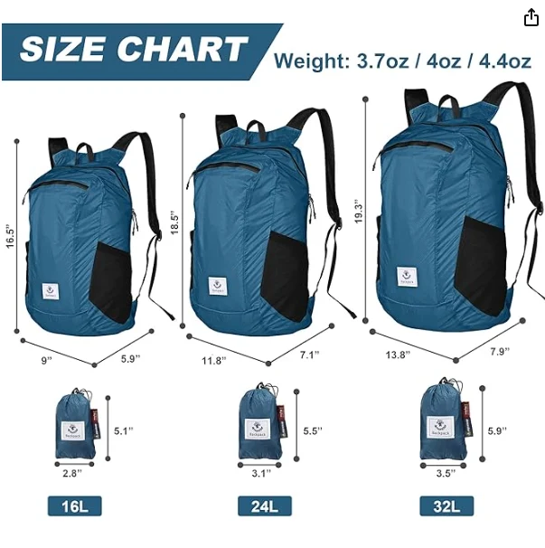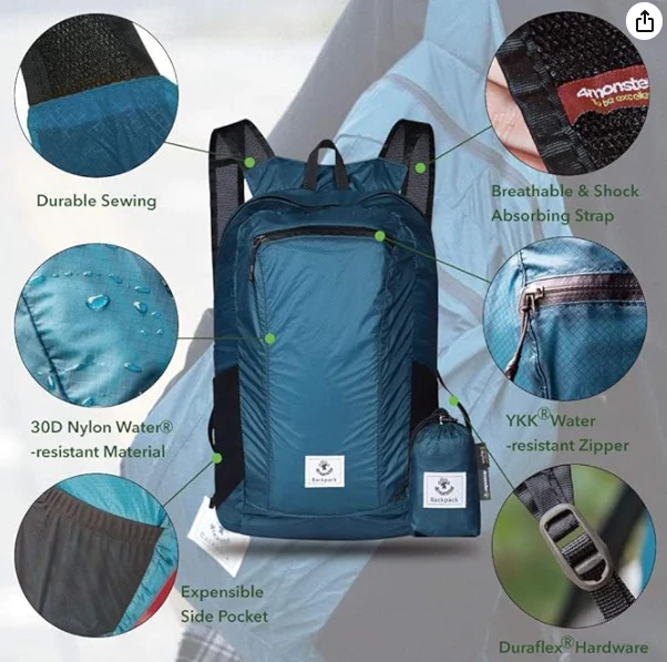 Суу өткөрбөгөн жеңил жырткы жипчелүү сейилдөөчү рюкзак, бүктөлүүчү рюкзак саякаттоо, кемпинг, сейилдөө, күндүк сапарлар жана соода кылуу үчүн жетиштүү орун берет. Негизги сыдырма чөнтөк, алдыңкы сыдырма чөнтөк жана эки тордук чөнтөккө кошулган. 30 күн эч кандай жабыркайт / акысыз алмашуу, 12 ай кепилдиги.